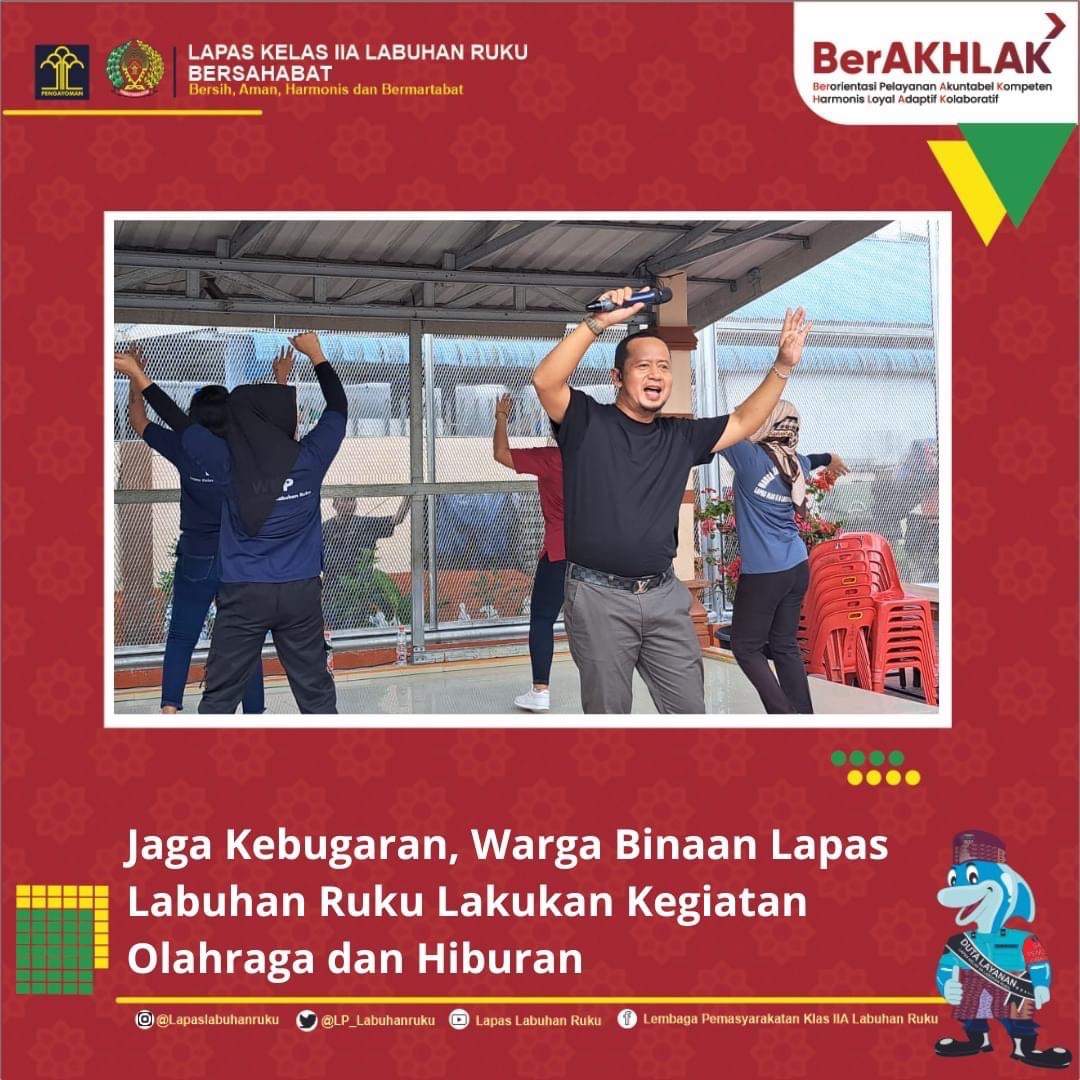 Bahagia tak harus mahal. Demikianlah yang dirasakan oleh Warga Binaan Pemasyarakatan (WBP) Lapas Labuhan Ruku Kanwil Kemenkumham Sumatera Utara. Karena pada hari tersebut mereka dapat berolahraga dan bernyanyi bersama. Tampak sejumlah pegawai juga tergabung dalam barisan dan melakukan gerakan yang sama mengikuti instruktur yang juga merupakan warga binaan, Sabtu (18/11/2023).