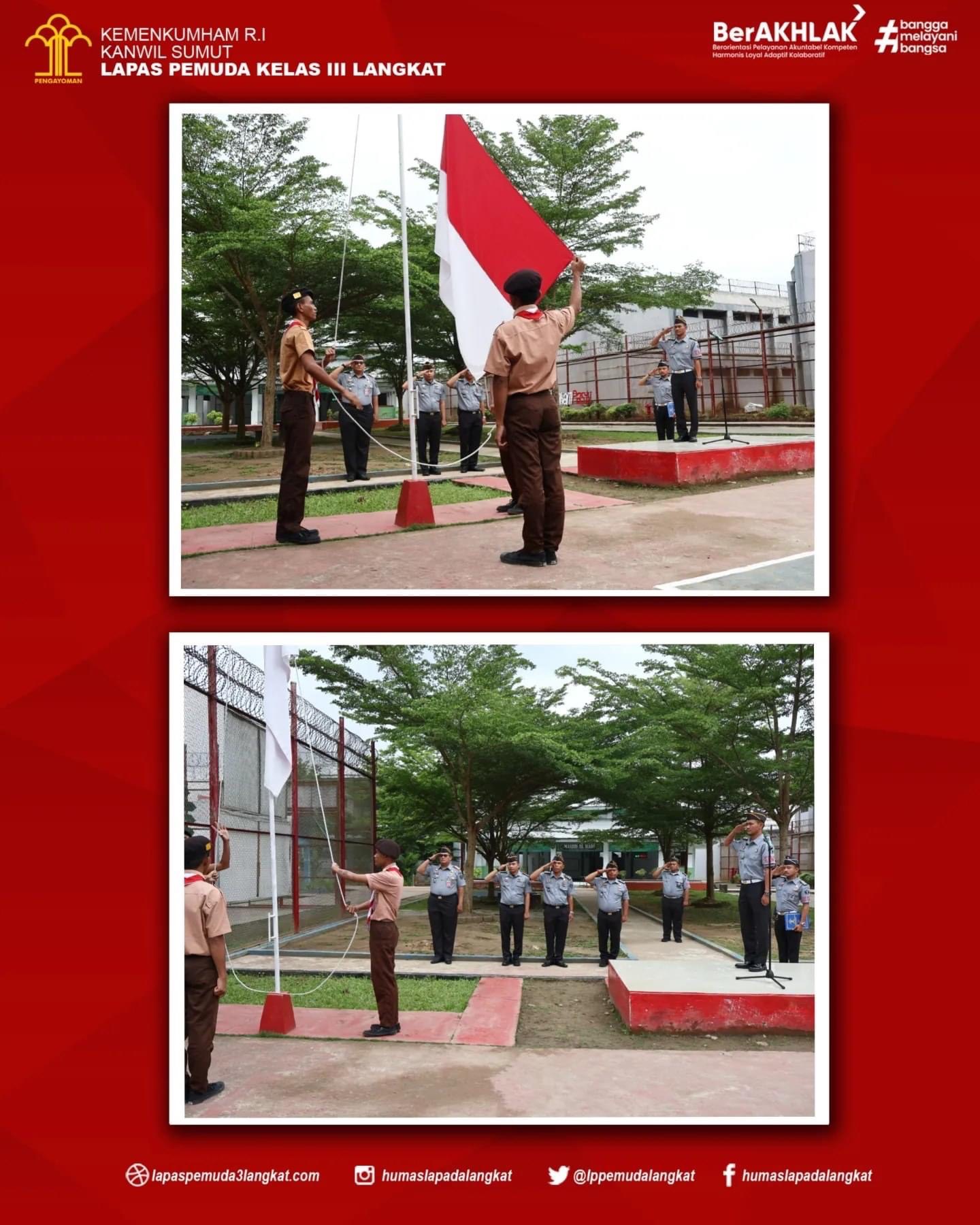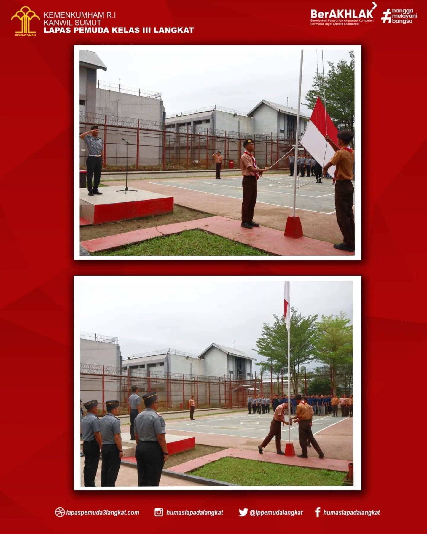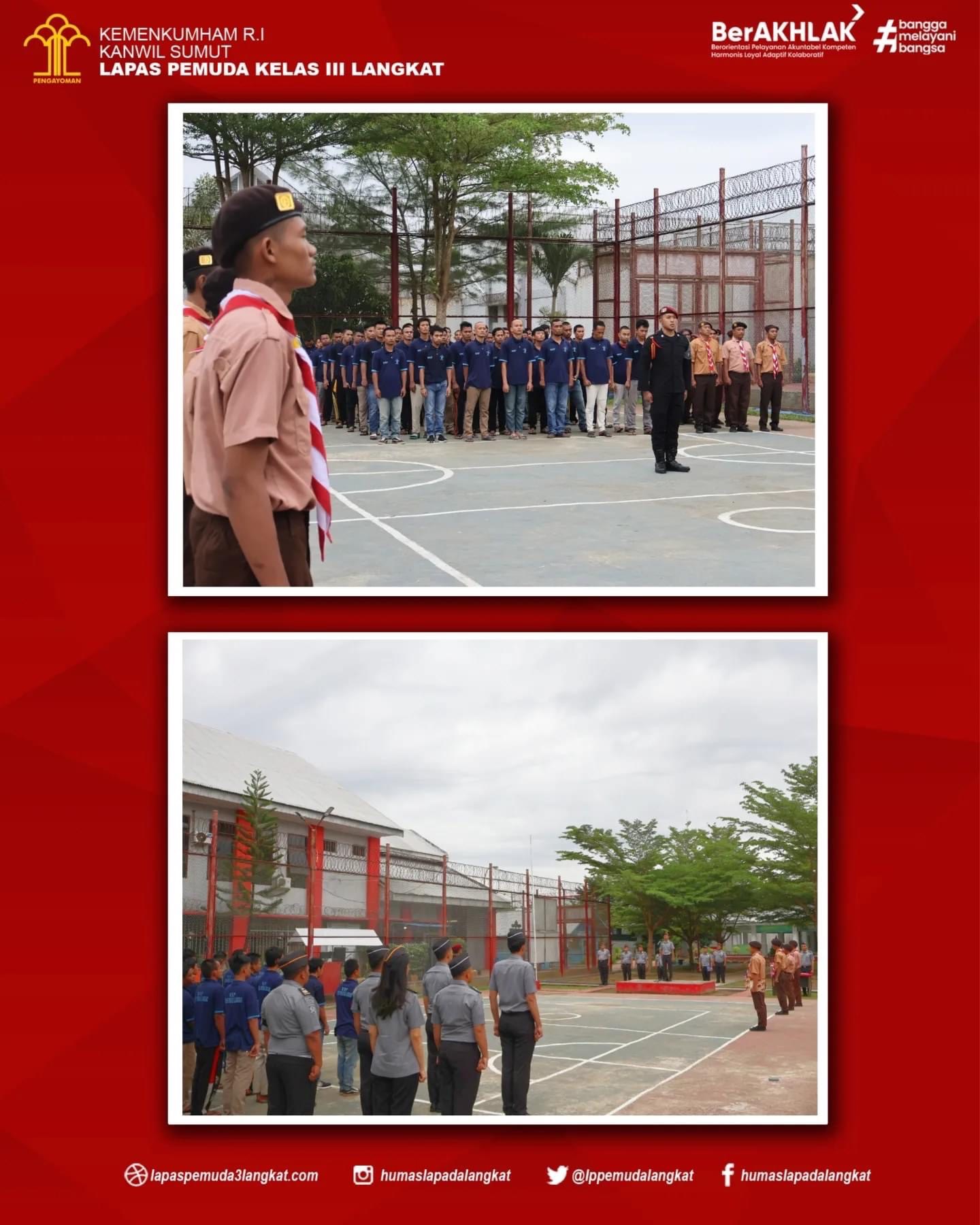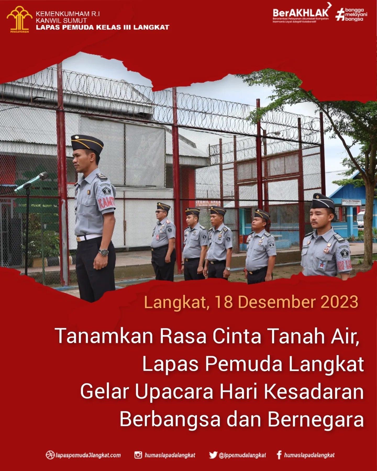 Dalam rangka menumbuhkan rasa kebangsaan dan cinta tanah air kepada warga binaan melalui pelaksanaan upacara kesadaran berbangsa dan bernegara yang dilaksanakan secara rutin untuk mendidik jiwa nasionalisme yang tinggi kepada warga binaan serta untuk memupuk disiplin dan tanggung jawab yang dimiliki sebagai insan yang berakhlak. Senin (18/12) di lapangan Upacara Gedung II Lapas Pemuda Langkat.