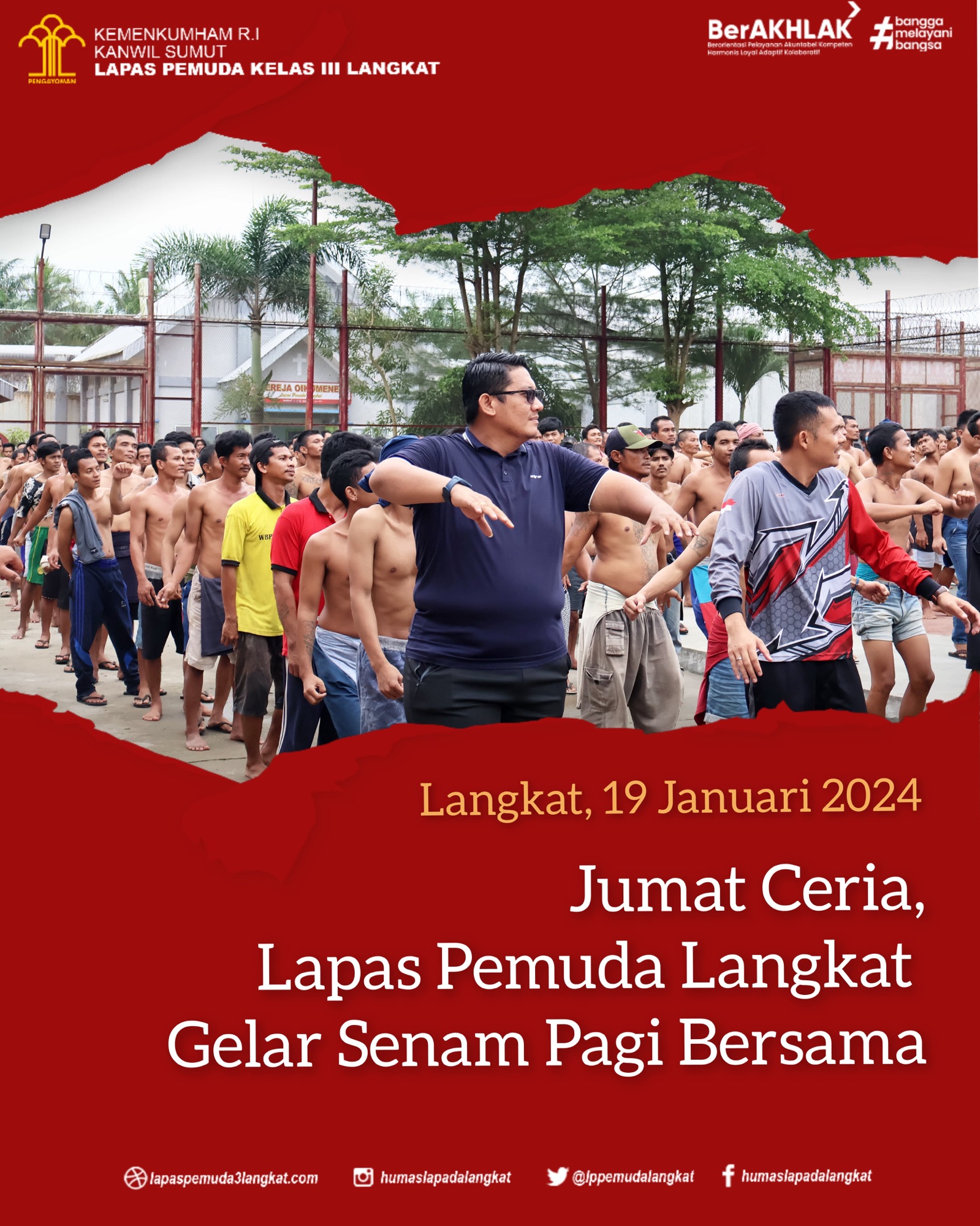 Dalam rangka meningkatkan daya tahan tubuh dan menjaga kesehatan, Salah satu upaya Lembaga Pemasyarakatan (Lapas) Pemuda Kelas III Langkat melaksanakan senam rutin bersama, Jumat(19/01).
