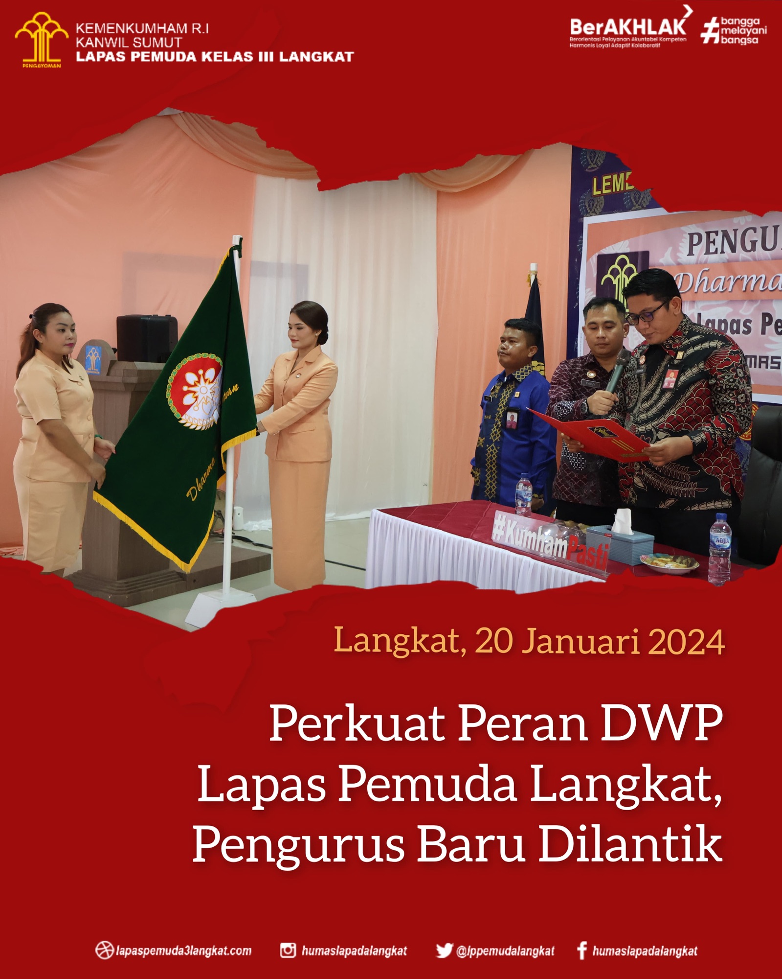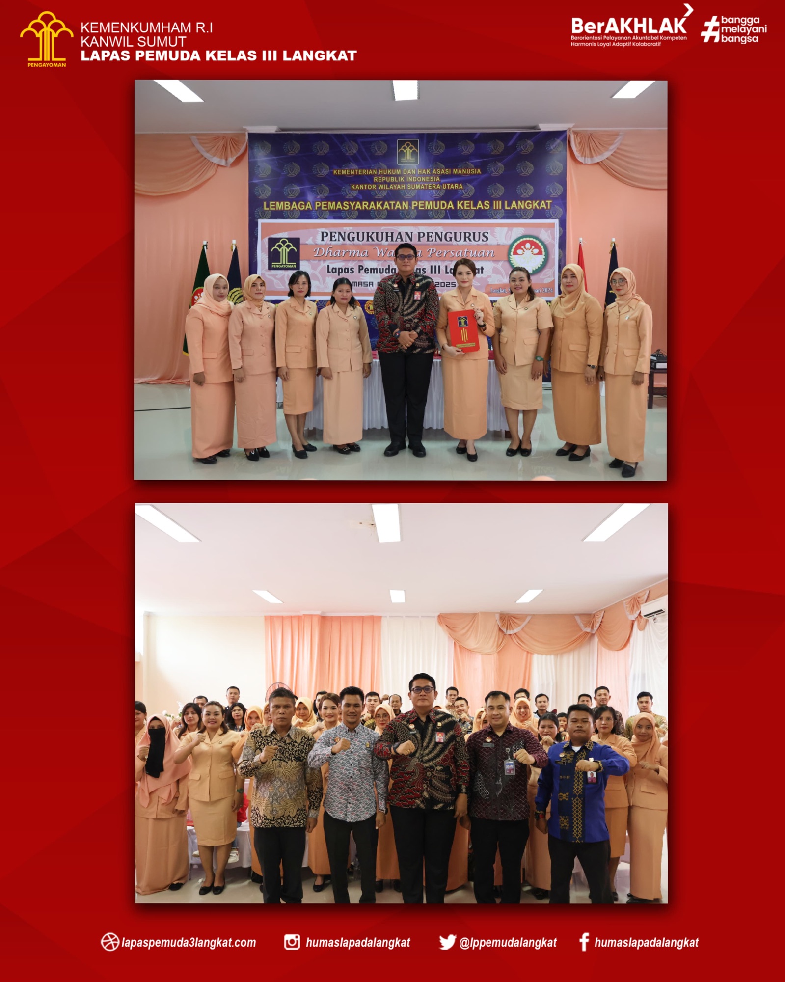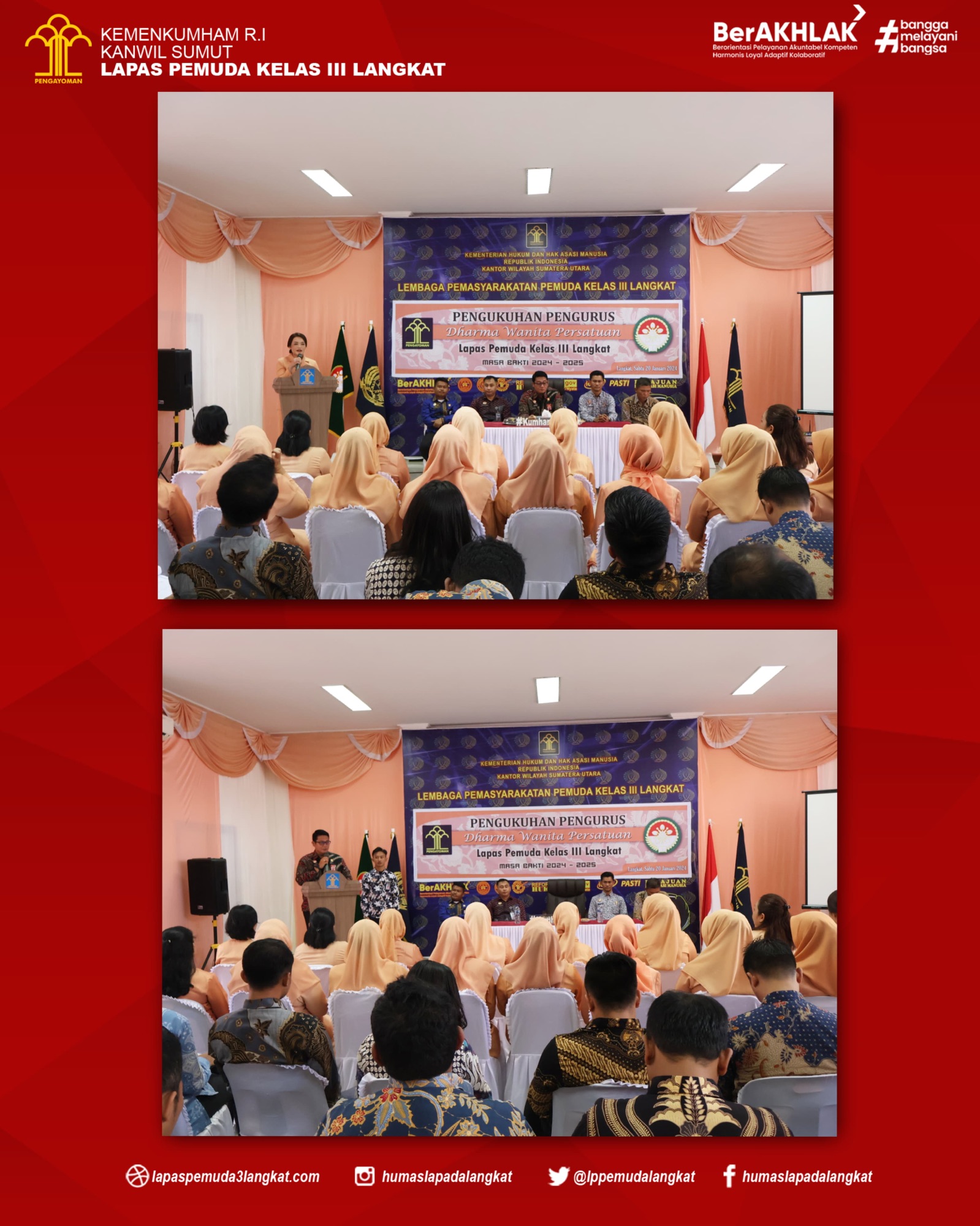 Dharma Wanita Persatuan (DWP) Lapas Pemuda Kelas III Langkat Kanwil Kemenkumham Sumut menggelar kegiatan Pengukuhan pengurus dan silaturahmi antar anggota. Kegiatan ini digelar di Aula Gedung I Lapas Pemuda Kelas III Langkat, Sabtu (20/01).