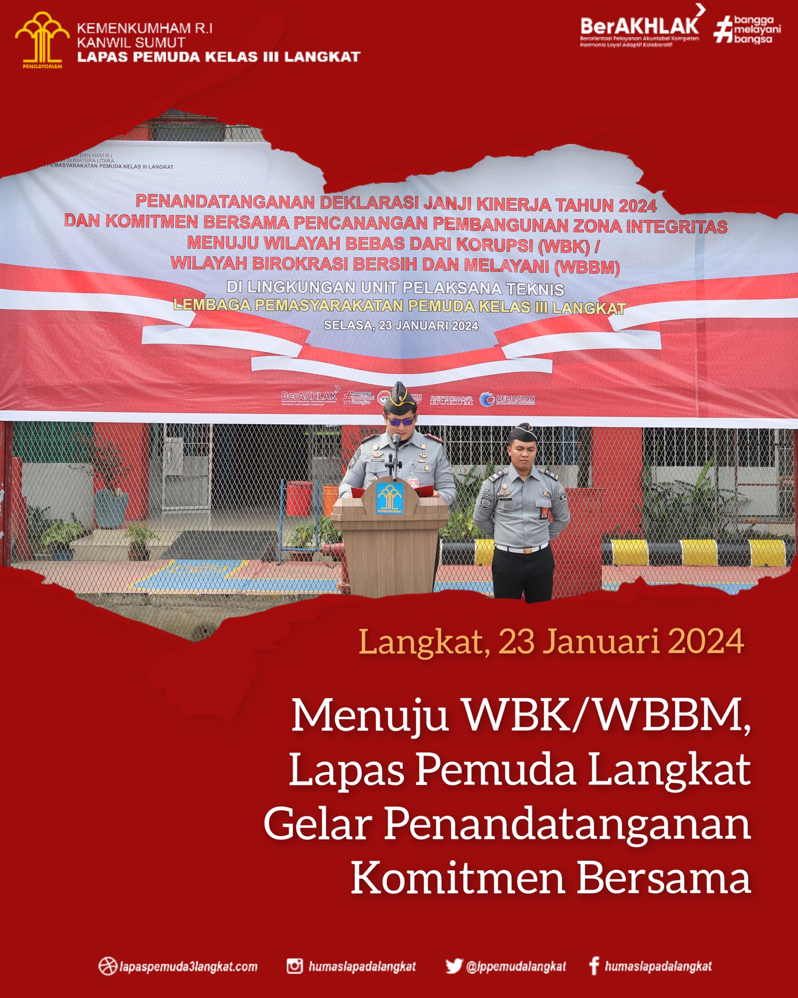 Lembaga Pemasyarakatan Pemuda Kelas III Langkat Kanwil Kemenkumham Sumut melaksanakan penandatanganan Komitmen Bersama pembangunan Zona Integritas Menuju Wilayah Bebas dari Korupsi (WBK) dan Wilayah Birokrasi Bersih Melayani (WBBM). Penandatanganan dilaksanakan di Lapangan Upacara Gedung II Lapas Pemuda Langkat, diikuti oleh Pejabat structural, jajaran pegawai, dan warga binaan Lapas Pemuda Langkat, dan disaksikan langsung oleh FORKOPIMDA setempat, Selasa, (23/01).