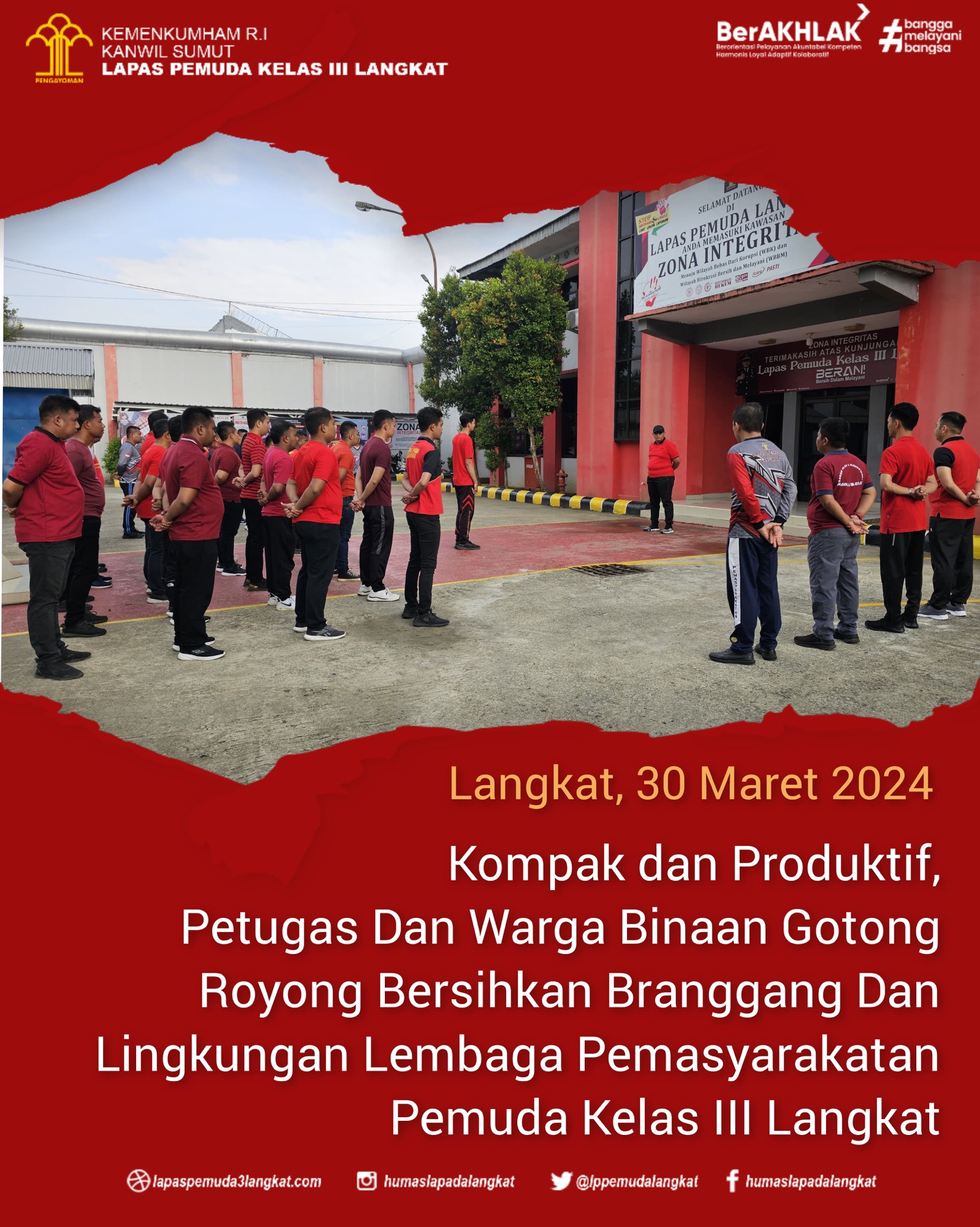 Bulan Suci Ramadhan 1445 H dijalani dengan semangat dan produktif, hal tersebut ditunjukkan oleh kekompakkan Warga Binaan dan Petugas Lembaga Pemasyarakatan Pemuda Kelas III Langkat yang semangat lakukan kegiatan gotong royong bersihkan Branggang dan Lingkungan Lapas Pemuda Kelas III Langkat, Sabtu (30/03).