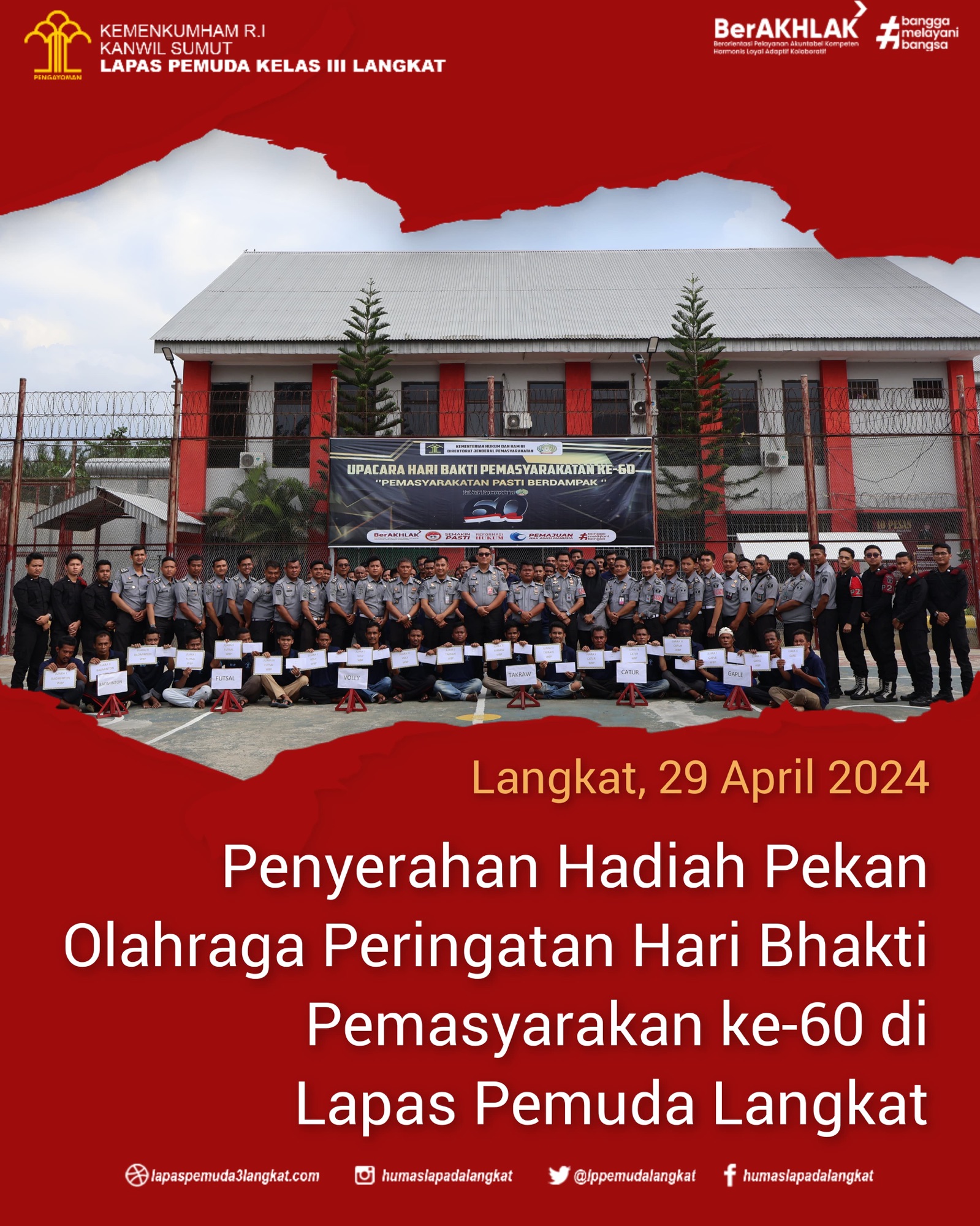 Rangkaian Peringatan Hari Bhakti Pemasyarakatan (HBP) ke 60 Tahun 2024 telah dilaksanakan di Lapas Pemuda Langkat, Lembaga Pemasyarakatan Pemuda Kelas III Langkar Kanwil Kemenkumham Sumut apresiasi Warga Binaan Pemasyarakatan dan Pegawai Peserta Kegiatan Pekan Olahraga dengan pembagian hadiah, Senin (29/04).