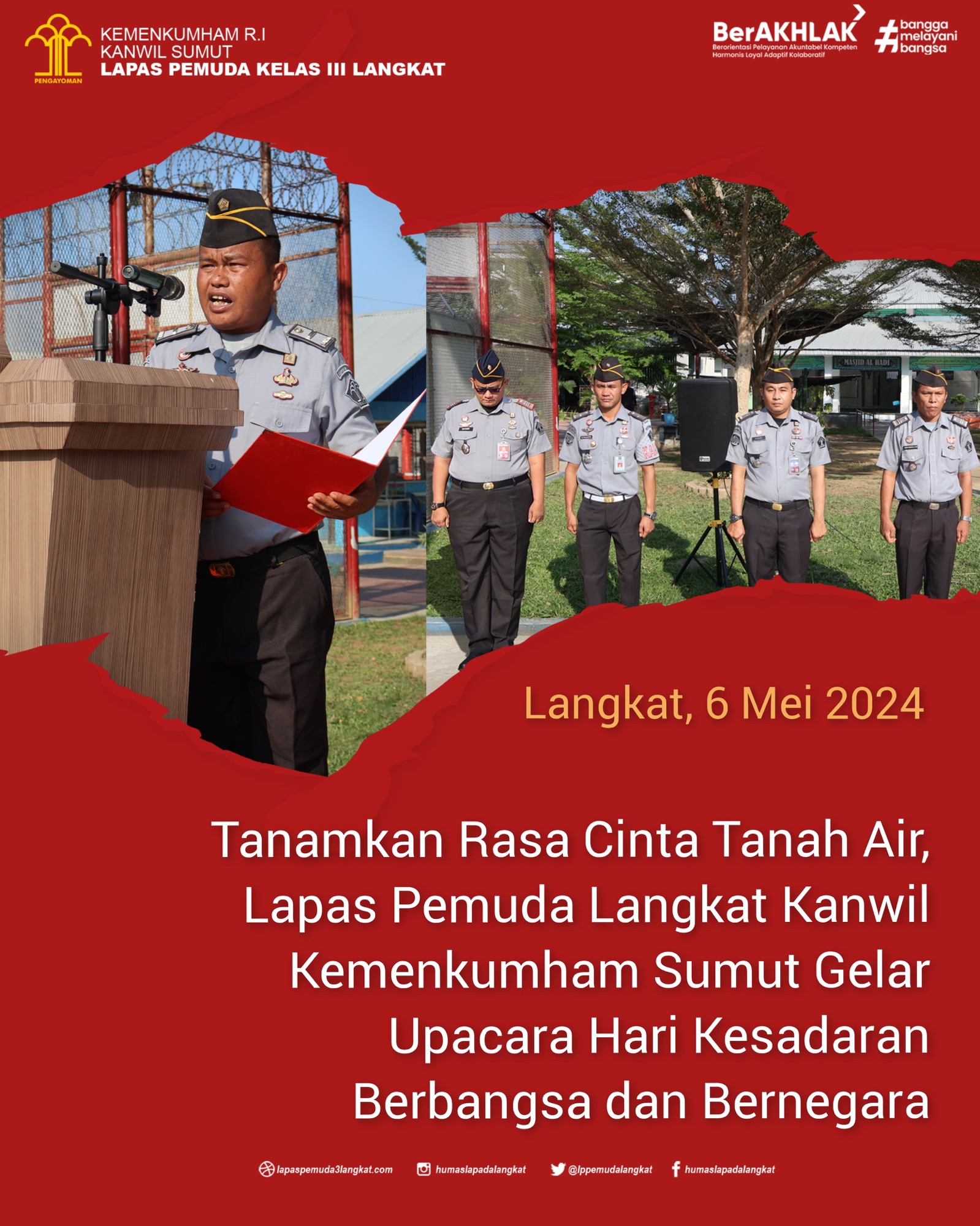 Dalam rangka menumbuhkan rasa kebangsaan dan cinta tanah air kepada warga binaan melalui pelaksanaan upacara kesadaran berbangsa dan bernegara yang dilaksanakan secara rutin untuk mendidik jiwa nasionalisme yang tinggi kepada warga binaan serta untuk memupuk disiplin dan tanggung jawab yang dimiliki sebagai insan yang berakhlak. Senin (06/05) di lapangan Upacara Gedung II Lapas Pemuda Langkat.