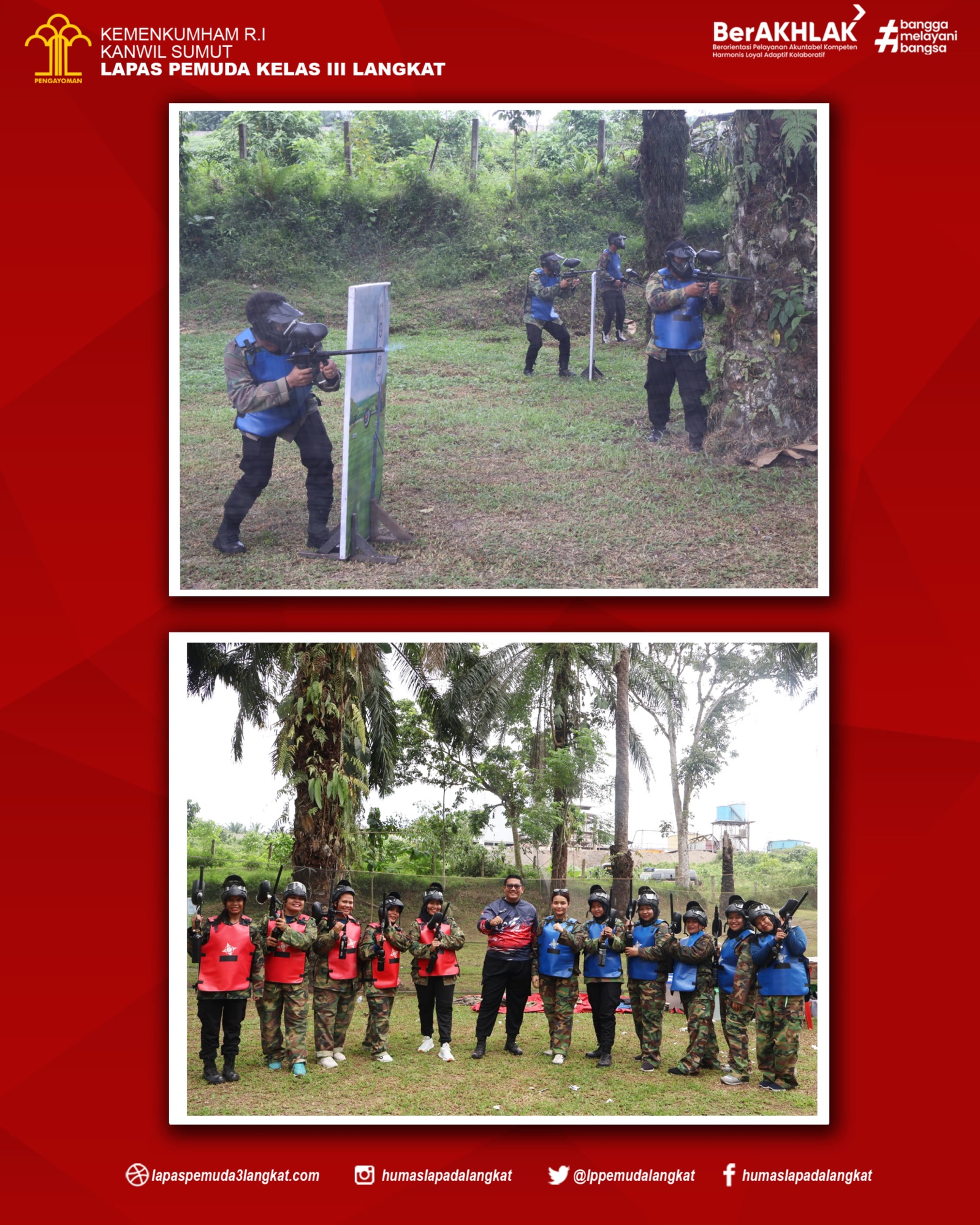 Lapas Pemuda Kelas III Langkat Kanwil Kemenkumham Kembali kembali berkomitmen dalam meningkatkan kualitas sumber daya manusia (SDM) dengan menggelar kegiatan Pembinaan Fisik, Mental, dan Disiplin (FMD) bagi para pegawai. Kegiatan ini berlangsung di Tanjung Langkat dan salah satu acara utamanya adalah permainan paintball, Sabtu (18/05). Hadir mengikuti kegiatan seluruh jajaran pegawai serta Ibu-ibu Dharma Wanita Lapas Pemuda Langkat.