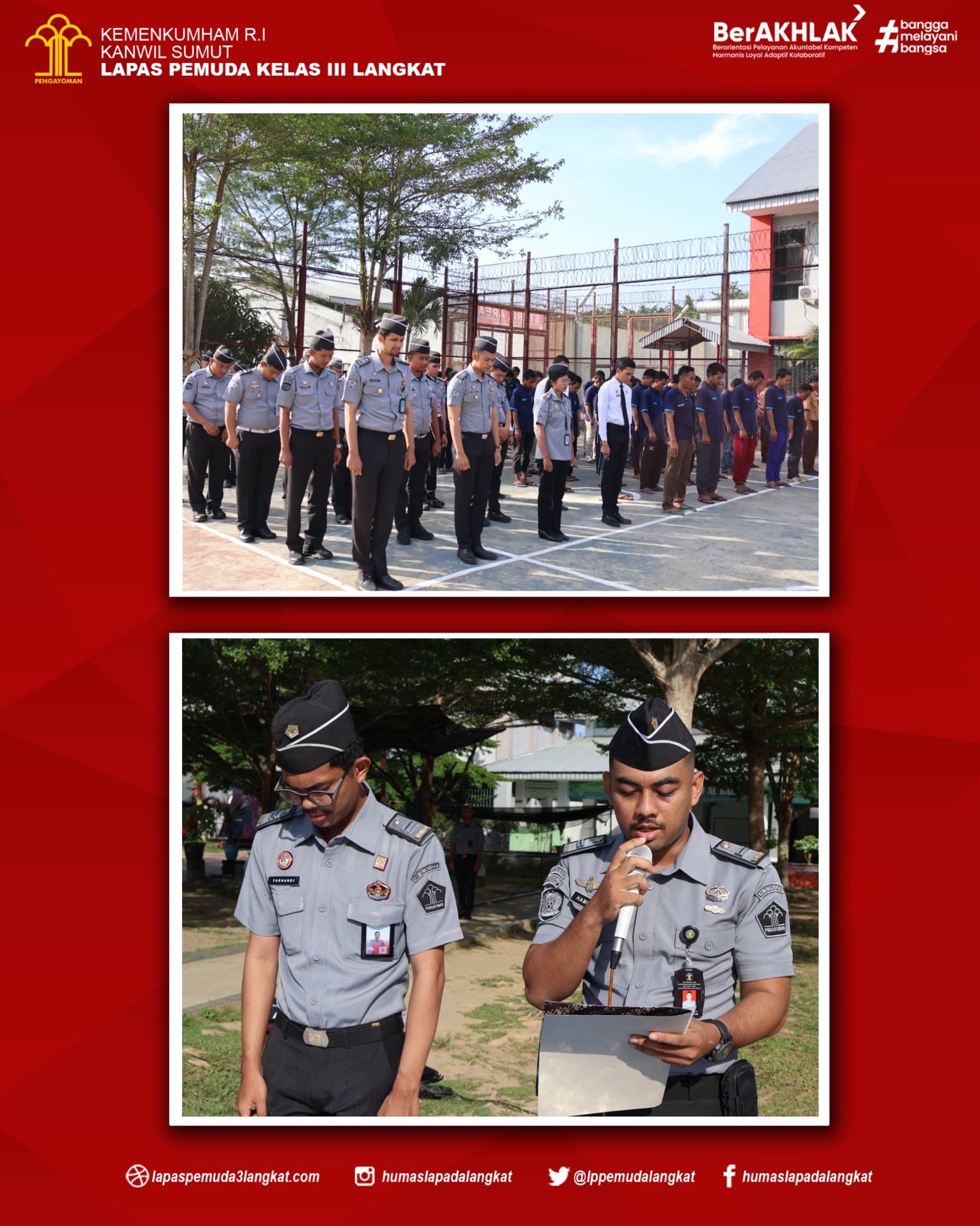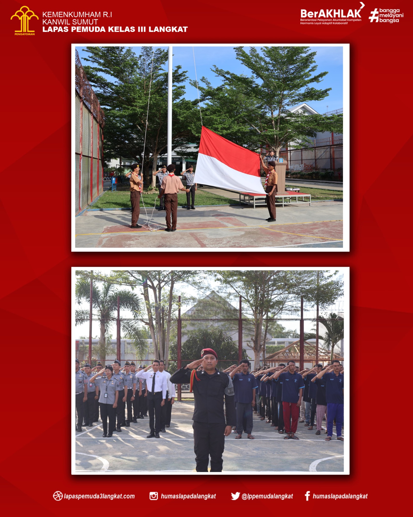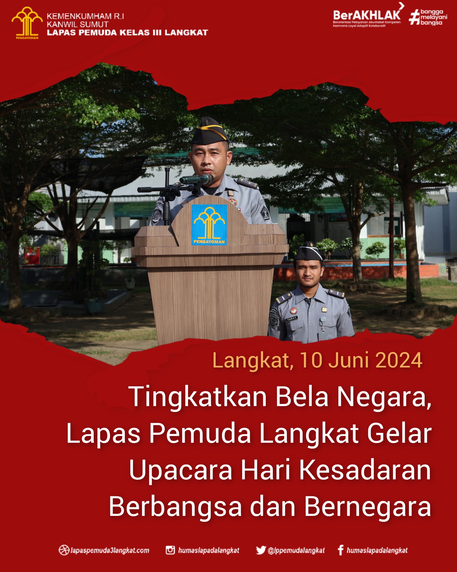 Dalam rangka menumbuhkan rasa kebangsaan dan cinta tanah air serta bela negara kepada warga binaan melalui pelaksanaan upacara kesadaran berbangsa dan bernegara yang dilaksanakan secara rutin untuk mendidik jiwa nasionalisme yang tinggi kepada warga binaan serta untuk memupuk disiplin dan tanggung jawab yang dimiliki sebagai insan yang berakhlak, Lapas Pemuda Langkat Kanwil Kemenkumham Sumut Gelar Upacara. Senin (10/06) di lapangan Upacara Gedung II Lapas Pemuda Langkat.