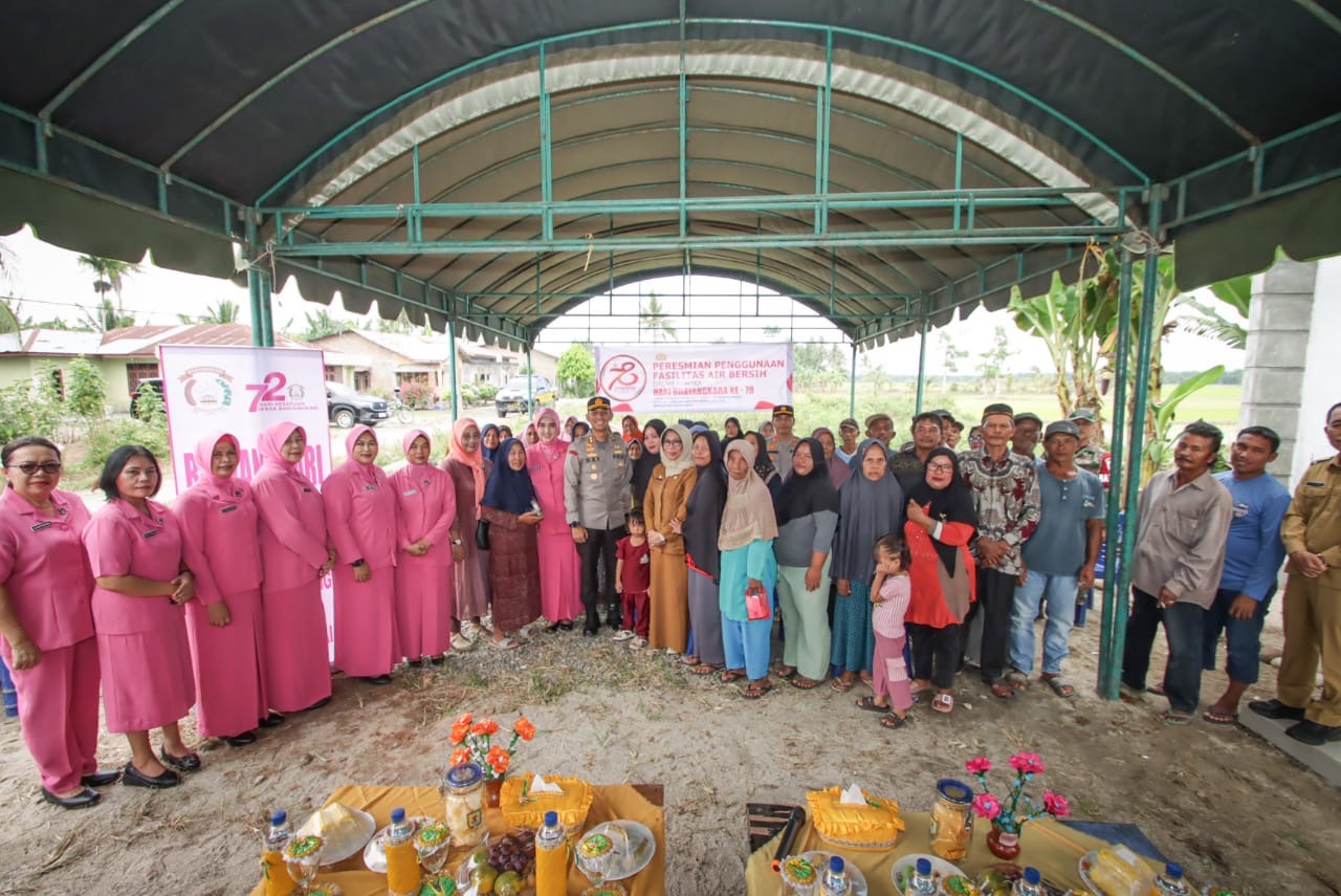 Kapolres Serdang Bedagai (Sergai), AKBP Oxy Yudha Pratesta meresmikan sarana air bersih sumur bor untuk memenuhi kebutuhan masyarakat di Dusun IV Desa Makmur, Kecamatan Telukmengkudu, Selasa (2/7). Peresmian Penggunaan air bersih merupakan bagian rangkaian Hari Bhayangkara ke-78, Polri Presisi Mendukung Percepatan Transformasi Ekonomi Insklusif dan Berkelanjutan Menuju Indonesia Emas. Turut hadir, Wakapolres Kompol Damos C Aritonang beserta para PJU, Ketua Bhayangkari Ny Septya Oxy beserta jajaran, Kadis PUTR Sergai Johan Sinaga, Kapolsek Telukmengkudu AKP Sugiono beserta unsur Forkopimcam, dan tokoh agama, tokoh masyarakat setempat. "Untuk kedua kalinya saya datang kemari. Pertama dikarenakan heboh masalah air bersih, dan yang kedua terbangunnya sarana air bersih" ujar Kapolres AKBP Oxy Yudha Pratesta mengawali sambutannya. Oxy mengatakan, terbangunnya sarana air bersih ini bukan dari kerja Polri Sendiri, melainkan atas kerjasama dengan Pemkab Sergai hingga masyarakat Desa Makmur memiliki bangunan sarana air bersih. "Saya terus berdiskusi dengan Bupati Sergai H Darma Wijaya untuk kebutuhan masyarakat, hingga akhirnya terbangun sarana air bersih ini. Jadi masyarakat juga harus memahami, pemerintah itu tidak bisa langsung membangun, harus melalui berbagai proses dan kita semua sangat berterima kepada Pemkab Sergai," terangnya. Bupati Sergai H Darma Wijaya diwakili Pj Sekdakab Rusmiani Purba mengapresiasi apa yang telah dilakukan Polres Sergai dalam mendukung pembangunan di Sergai. "Atas koordinasi dan masukan dari Bapak Kapolres Sergai, Pemkab Sergai mewujudkan impian masyarakat Desa Makmur untuk mendapatkan air bersih. Tentunya, Pemkab Sergai berharap masyarakat dapat menjaga fasilitas air bersih tersebut," ujarnya. Atas nama pemerintah desa dan masyarakat, Kades Makmur Saprik sangat berterima kasih kepada Polres Sergai dan Pemkab Sergai atas pembangunan sarana air bersih di desa tersebut. "Kini, warga tidak lagi kesulitan untuk mendapatkan air bersih yang layak untuk diminum," ujarnya. (Sopiyan)