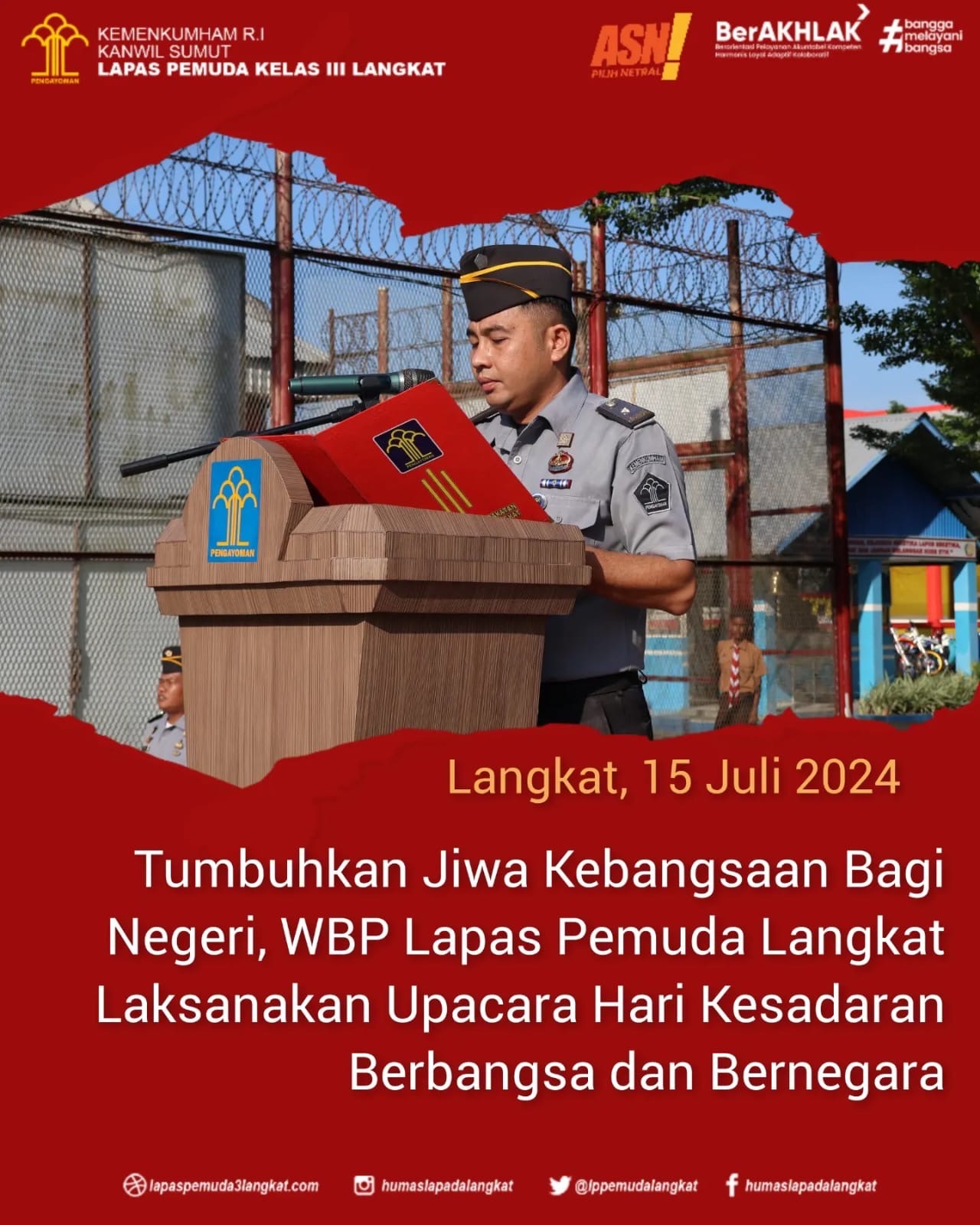 Dalam rangka menumbuhkan rasa kebangsaan dan cinta tanah air serta bela negara kepada warga binaan melalui pelaksanaan upacara kesadaran berbangsa dan bernegara yang dilaksanakan secara rutin untuk mendidik jiwa nasionalisme yang tinggi kepada warga binaan serta untuk memupuk disiplin dan tanggung jawab yang dimiliki sebagai insan yang berakhlak, Lapas Pemuda Langkat Kanwil Kemenkumham Sumut Gelar Upacara. Senin (15/07) di lapangan Upacara Gedung II Lapas Pemuda Langkat.