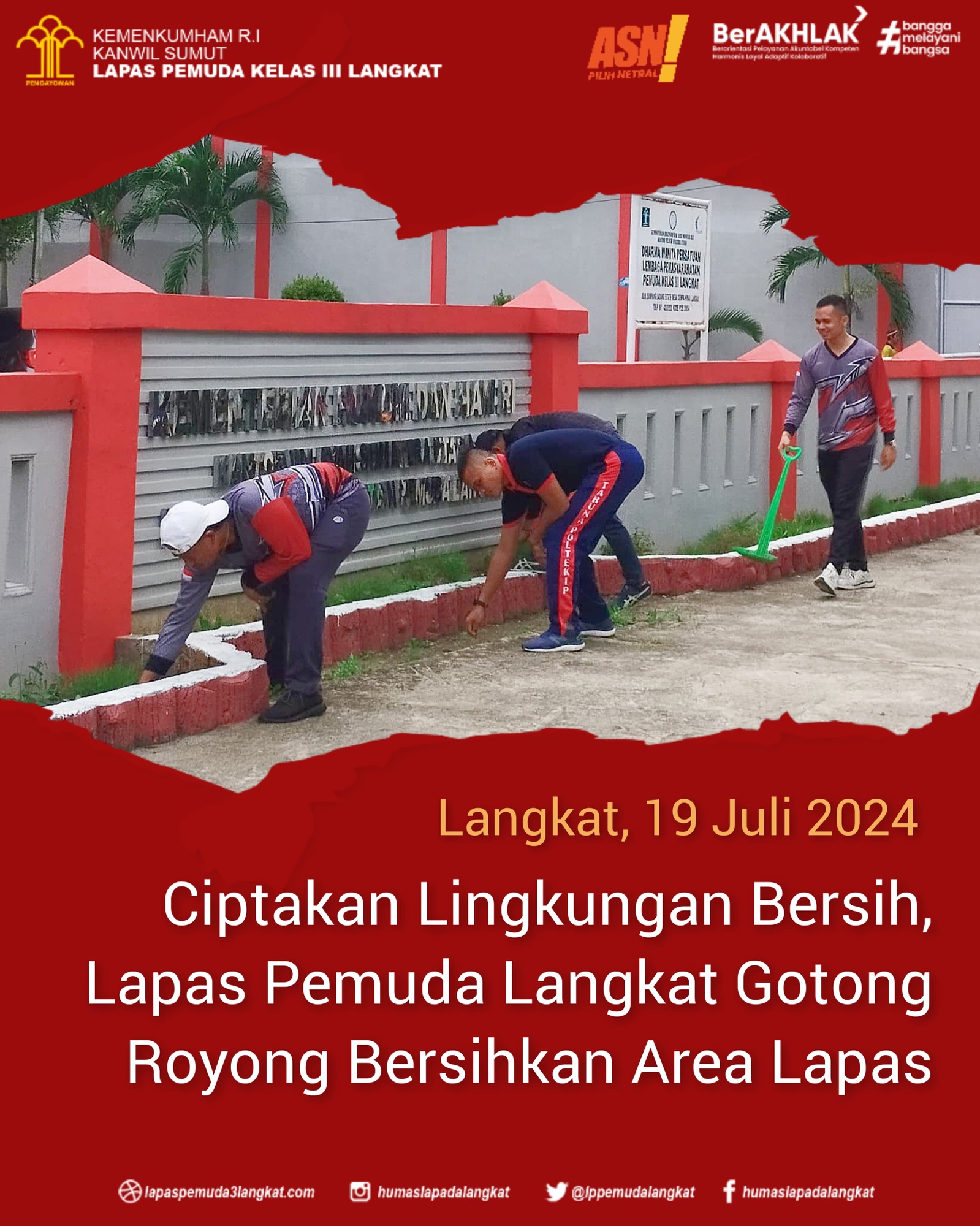 Jajaran Lapas Pemuda Kelas III Langkat Kanwil Kemenkumham Sumut menggelar kegiatan bersih-bersih area lapas. Kegiatan ini merupakan bagian dari upaya untuk menjaga kebersihan dan kesehatan lingkungan di sekitar lapas. Kegiatan gotong royong ini dilaksanakan setelah jam apel pagi Petugas telah selesai dilaksanakan, Jumat (19/07).