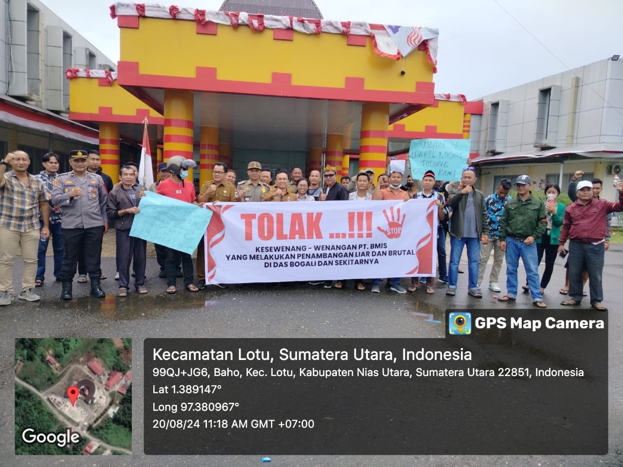 Ratusan Masyarakat yang berasal dari Desa Tetehosi Maziaya dan Desa Botombawo Kecamatan Sitolu’ori berorasi di Kantor Bupati Nias Utara; hendak menyampaikan tuntutan mereka atas perusahaan PT Bina Mitra Indo Sejahtera (PT. BMIS) yang melakukan penambangan galian golongan C di Daerah Aliran Sungai Bogali secara liar dan brutal, Selasa (20 Agustus 2024).