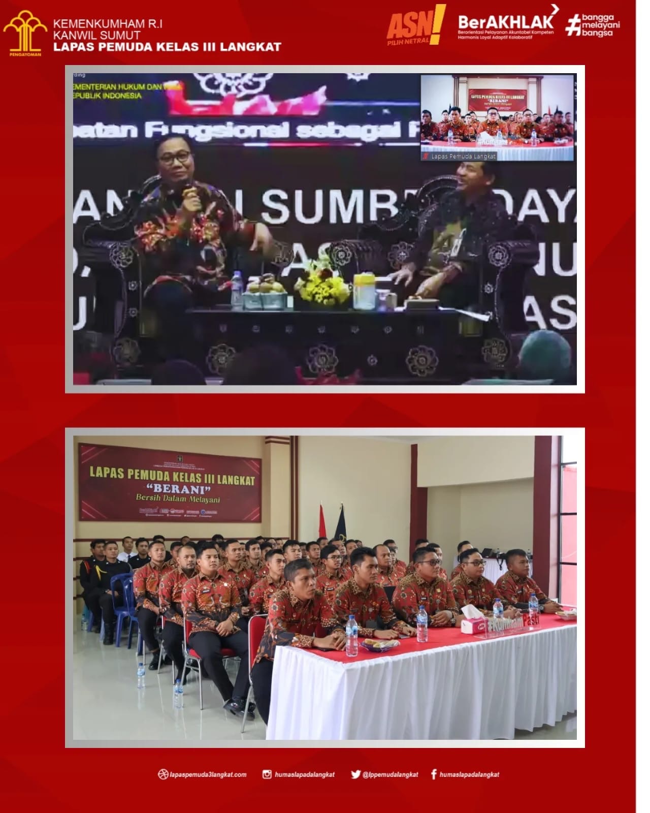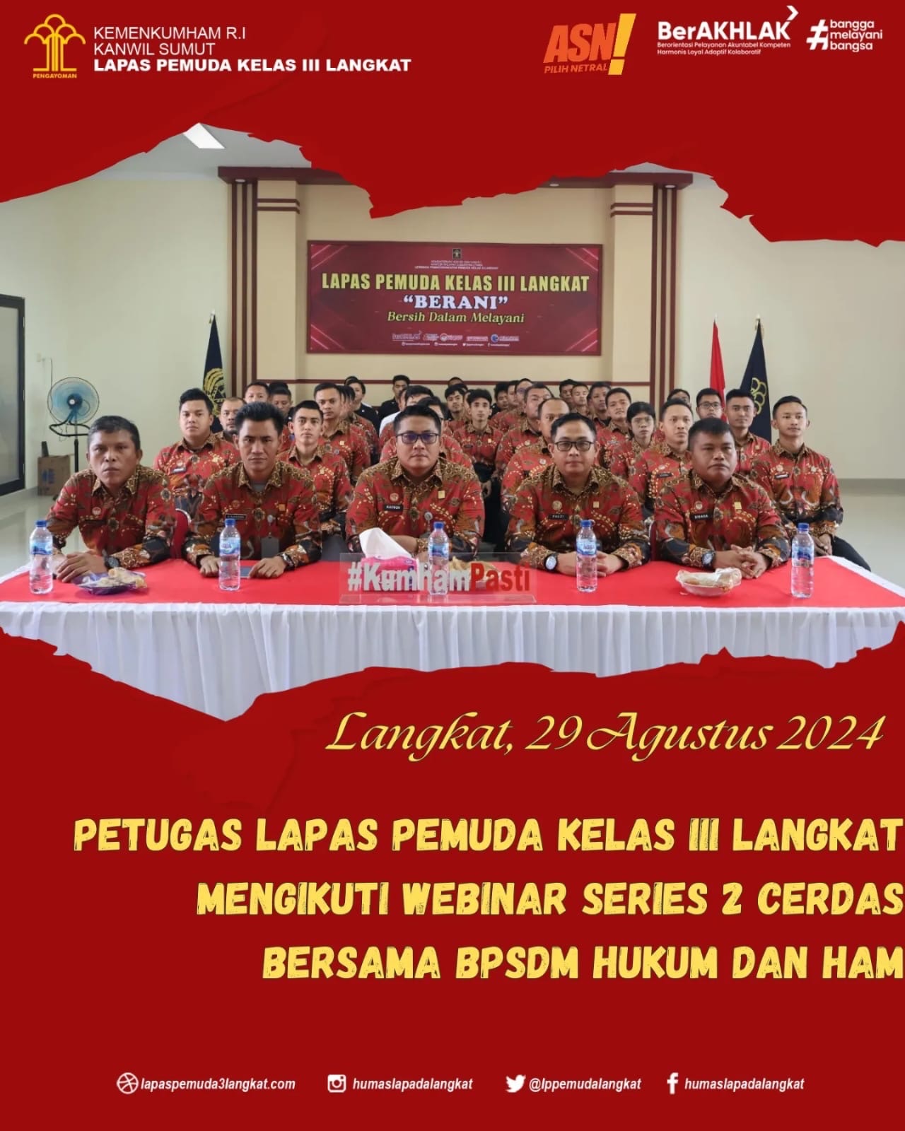 Langkat- Jajaran Petugas Lembaga Pemasyarakatan Pemuda Kelas III Langkat Mengikuti Webinar Series 2 Cerdas Bersama BPSDM Hukum dan HAM yang bertema ‘Karier dan Kinerja Jabatan Fungsional Sebagai Penggerak Pembangunan ASN BerAkhlak’ di Aula Lapas Pemuda Langkat (29/08).