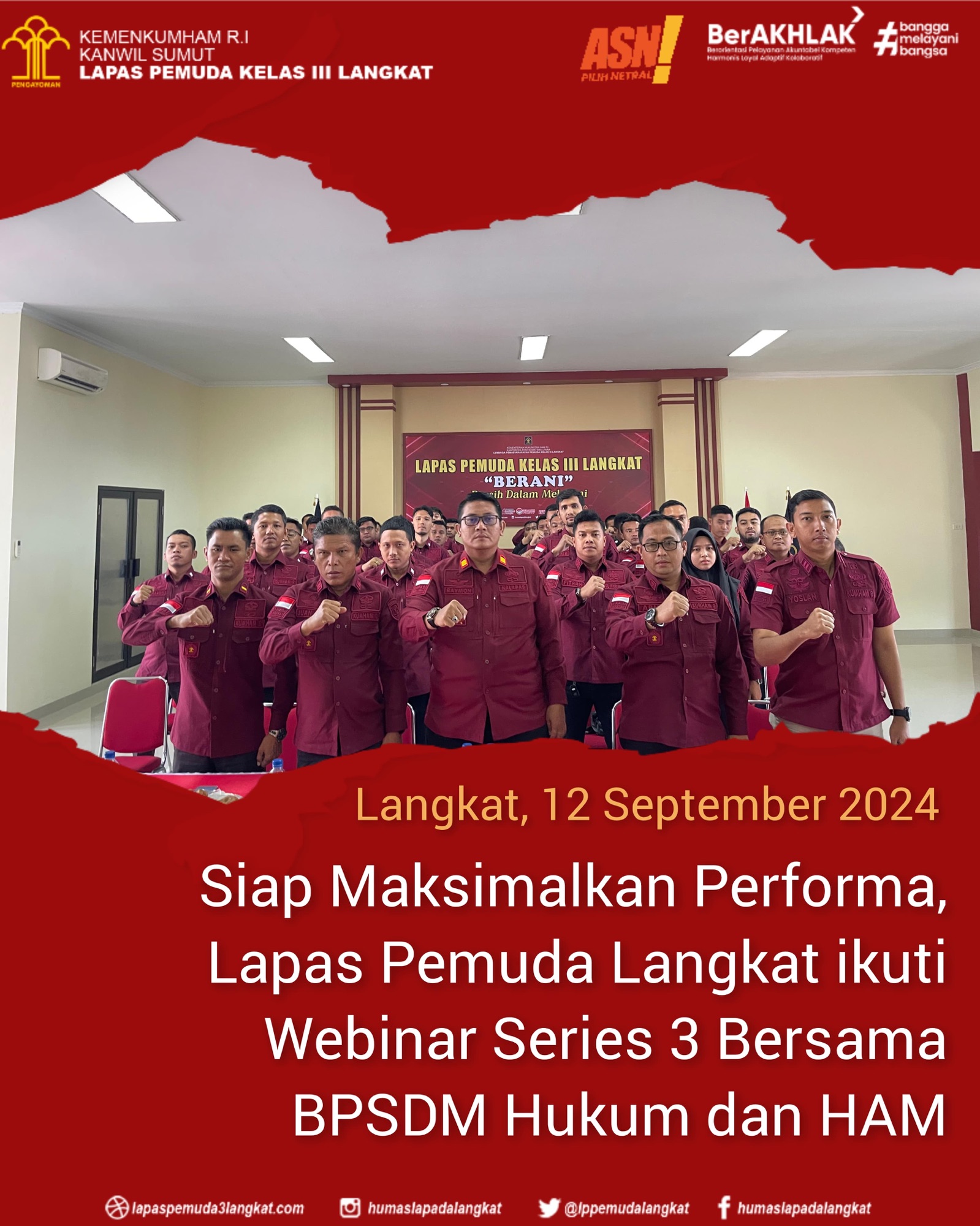 Langkat – Dalam rangka penigkatan kompetensi dan memaksimalkan performa dalam melaksanakan Tugas Pokok dan Fungsi, Lapas Pemuda Kelas III Langkat Kanwil Kemenkumham Sumut Ikuti Webinar Series 3 Bersama BPSDM Hukum dan HAM melalui zoom meeting. Kamis (12/09/2024). Bertempat di Aula Gedung I Lapas Pemuda Langkat.