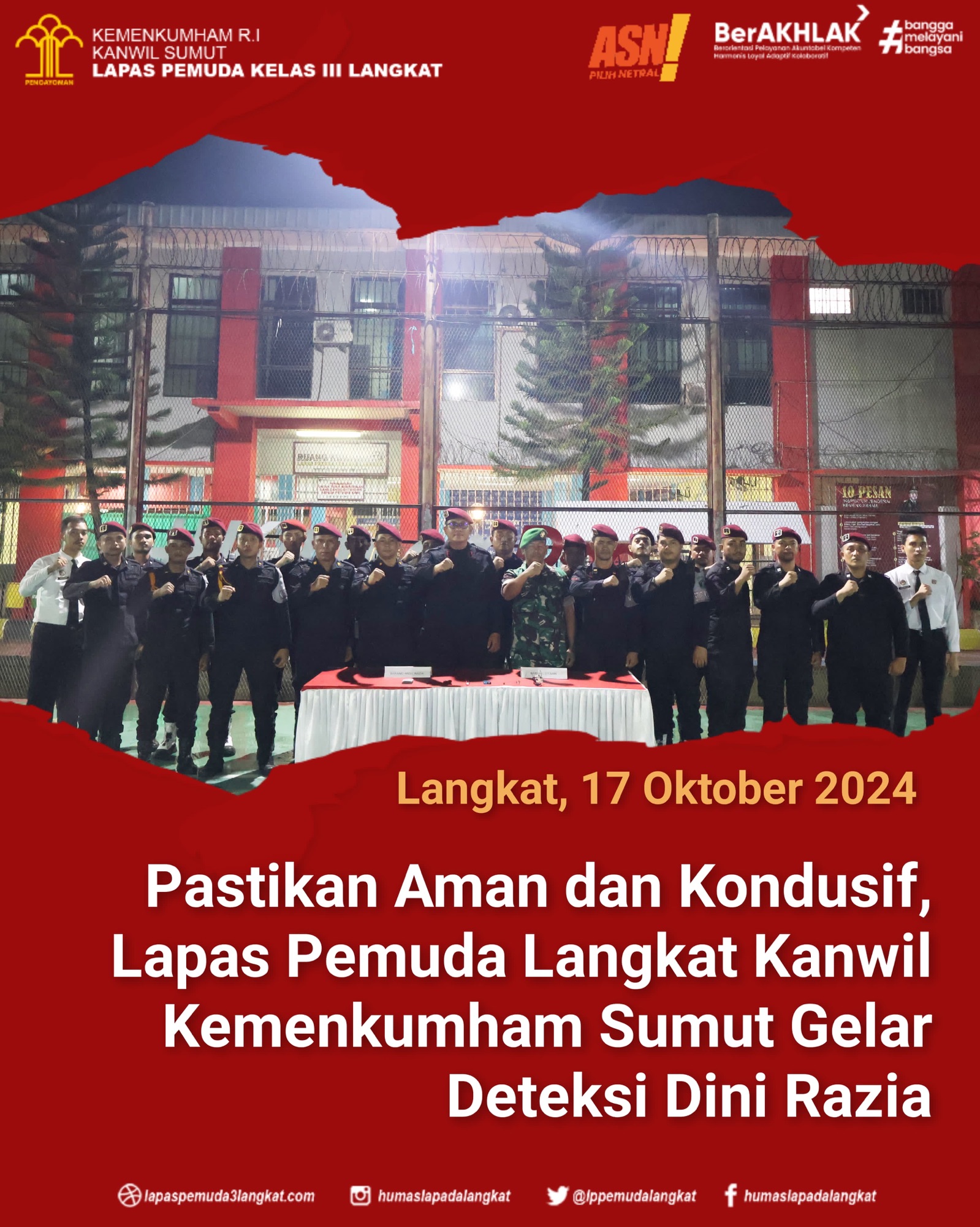 Kegiatan razia yang dipimpin langsung oleh Kalapas Pemuda Langkat, Raymon Andika Girsang dan didampingi oleh Kasubsi Kamtib, Hotler Krisman Pasaribu, Kaur Tata Usaha, Abul Fauzi Tarigan, Kasubsi AO, Juan Carlos, staf, regu pengamanan serta bersinergi dengan Babinsa Koramil Hinai melakukan razia ke blok hunian dan dimulai pada pukul 20.00 WIB sampai dengan selesai.