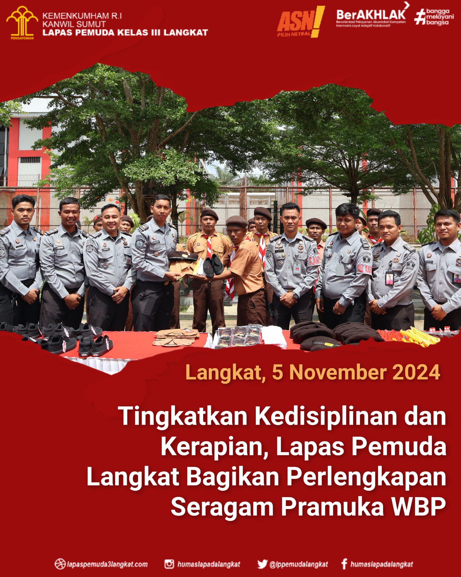 “Perlengkapan seragam ini untuk menciptakan keseragaman dalam berpakaian bagi WBP supaya lebih disiplin dan rapi serta mempermudah petugas dalam melakukan pengawasan, pengamanan, dan pemantauan WBP yang sedang melakukan kegiatan Pramuka serta menambah semangat anggota Pramuka di Lapas Pemuda Langkat,” jelasnya.