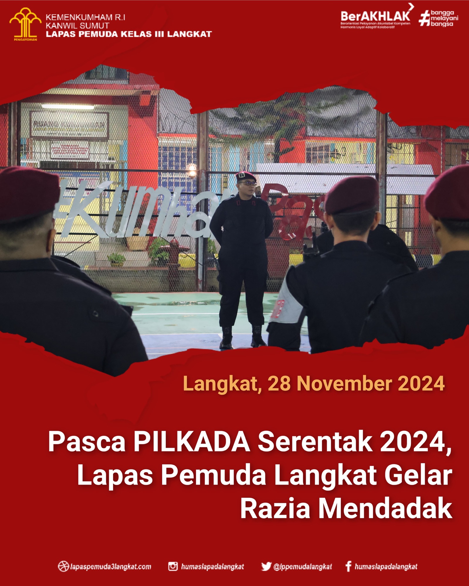 Langkat- Pilkada Serentak 2024 telah usai oleh karena itu dalam rangka menciptakan kemanan dan ketertiban serta memastikan Zero Halinar yang artinya tidak adanya Handphone, Pungli dan Narkotika, Jajaran Lapas Pemuda Langkat Kanwil Kemenkumham Sumut Gelar Deteksi Dini Razia Mendadak ke blok hunian, Kamis (28/11/2024).