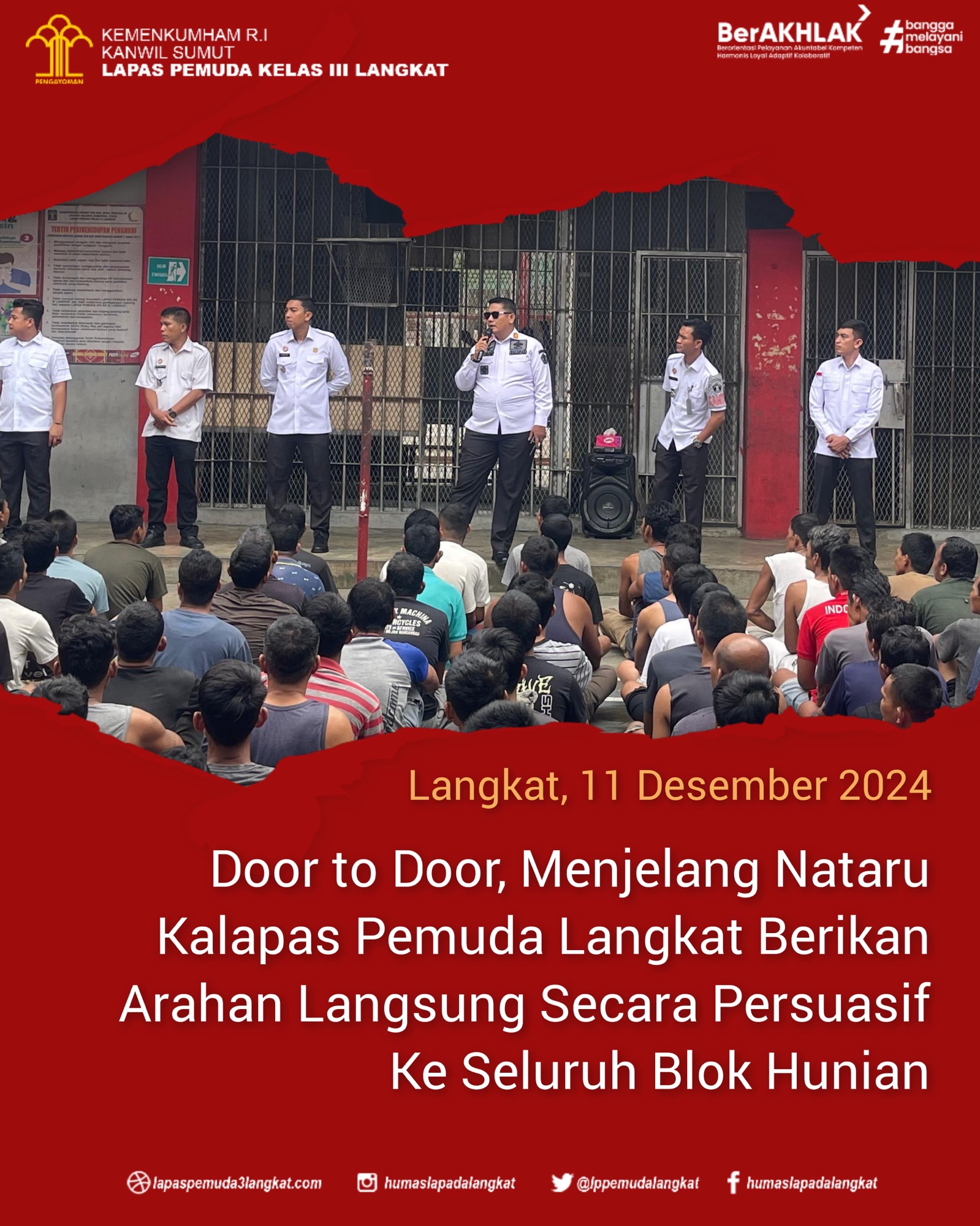 Langkat – Dalam rangka menghadapi Natal 2024 dan Tahun Baru 2025, Kepala Lembaga Pemasyarakatan (Lapas) Pemuda Kelas III Langkat, Raymon Andika Girsang bersama jajajaran gelar Kegiatan Door to Door Pengarahan Langsung kepada Warga Binaan bertempat di Lapangan Seluruh Blok Hunian Lapas Pemuda Langkat, Rabu (11/12/2024).