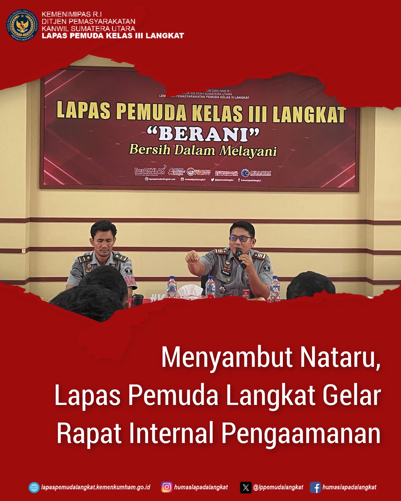 Langkat – Dalam rangka peningkatan keamanan dan ketertiban menyambuta Natal 2024 dan Tahun Baru 2025, Lapas Pemuda Kelas III Langkat Kanwil Kemenkumham Sumut, menggelar rapat penguatan tugas pokok dan fungsi pengamanan, Kamis (17/10/2024). Bertempat di Lt III Gedung 1 Lapas Pemuda Langkat.