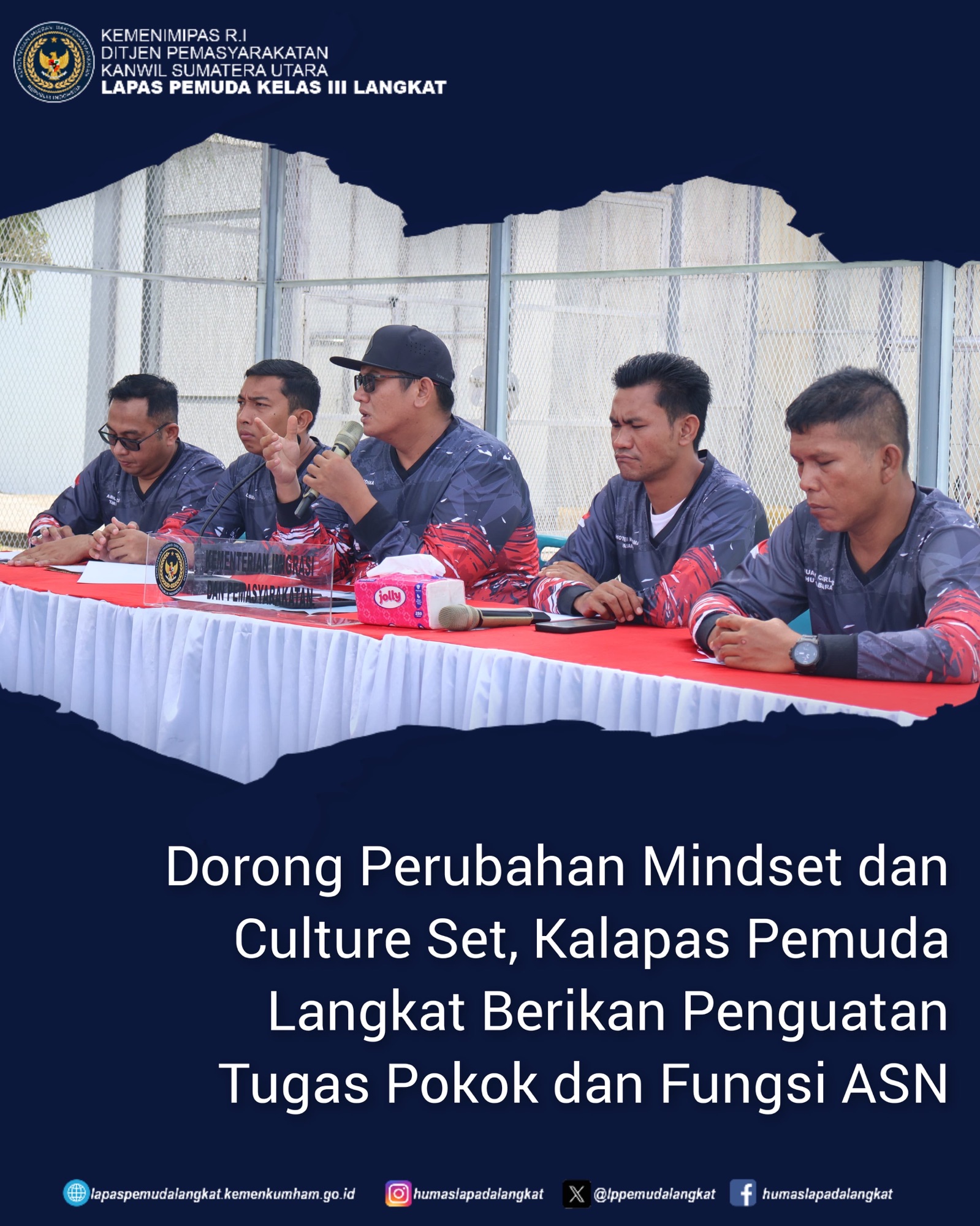 Langkat – Dalam rangka meningkatkan kualitas dan kuantitas dalam bekerja serta merubah mindset dan culture set, Lapas Pemuda Kelas III Langkat Gelar Rapat Dinas Khusus Penguatan Tugas Pokok dan Fungsi ASN (Aparatur Sipil Negara), Jumat (07/03/2025). Bertempat di Lapangan Upacara Lapas Pemuda Langkat.