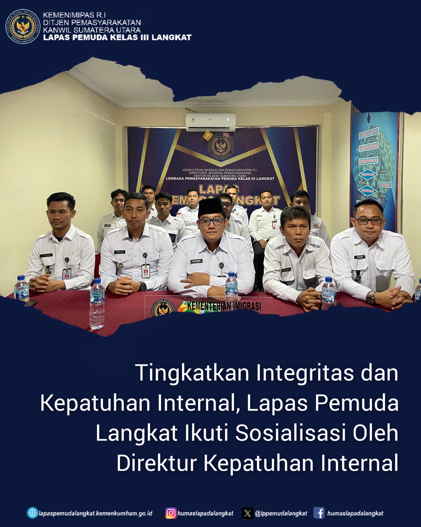 Langkat – Kepala Lembaga Pemasyarakatan (Lapas) Pemuda Kelas III Langkat, Raymon Andika Gitsang beserta jajaran sosialisasi mengenai pengawasan internal terhadap potensi pelanggaran petugas pada satuan kerja pemasyarakatan oleh Direktorat Kepatuhan Internal Direktorat Jenderal Pemasyarakatan secara virtual, Rabu (19/03/2025).