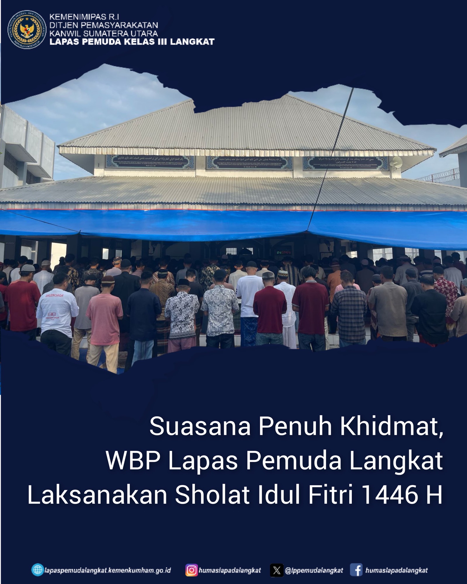 Gema takbir terus berkumandang ke penjuru Lembaga Pemasyarakatan Pemuda Kelas III Langkat sejak malam hari, sebagai pertanda telah tiba hari kemenangan Idul Fitri 1 Syawal 1446 H yang dihadiri Kepala Lapas Pemuda Kelas III Langkat dan jajaran serta warga binaan.