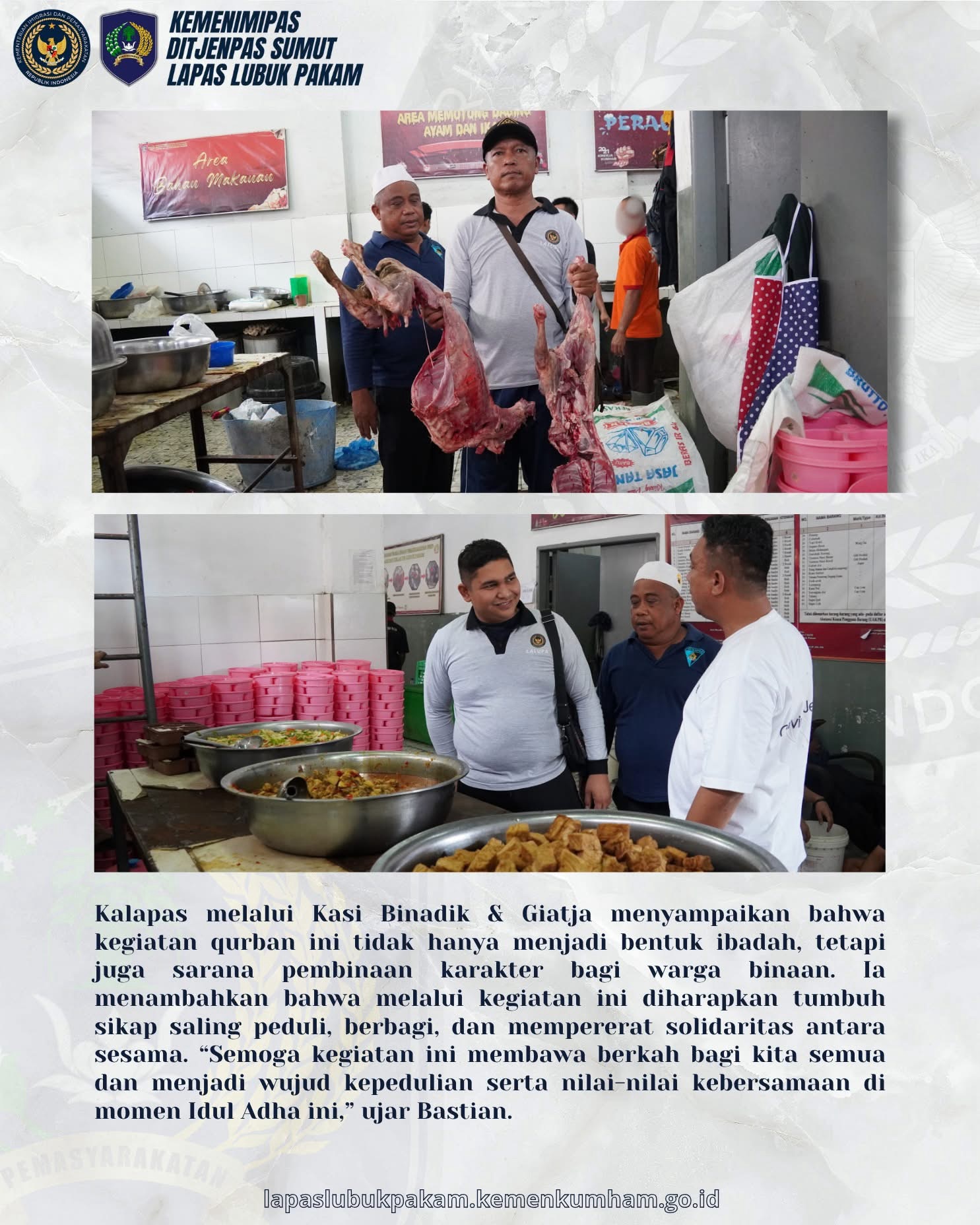 Dalam rangka memperingati Hari Raya Idul Adha 1446 Hijriah, Lembaga Pemasyarakatan Lubuk Pakam melaksanakan kegiatan pemotongan hewan qurban. Pada tahun ini Lapas Lubuk Pakam menerima dan menyembelih 2 (dua) ekor lembu dan 5 (lima) ekor kambing. Kegiatan ini berlangsung dengan khidmat dan penuh kebersamaan di lingkungan Lapas. kegiatan yang dilaksanakan pukul 04.00 WIB dihadiri oleh Kalapas Lubuk Pakam yang diwakili oleh Kasi Binadik & Giatja, Bastian Manik; Kasubsi Perawatan, Sukadi dan staf dapur. Kegiatan ini menjadi bagian dari pembinaan keagamaan yang rutin dilaksanakan setiap tahun, sebagai bentuk syukur sekaligus upaya memperkuat nilai-nilai spiritual di lingkungan Lapas. Hasil dari pemotongan hewan Qurban ini akan dibagi kepada Warga Binaan.
