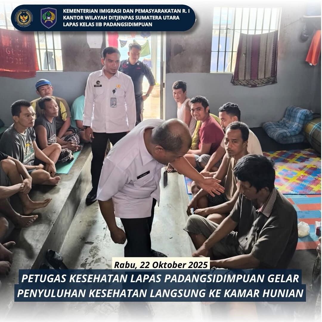 Padangsidimpuan, Dalam upaya meningkatkan kesehatan dan kesejahteraan warga binaan, Lapas Kelas IIB Padansidimpuan melaksanakan kegiatan penyuluhan kesehatan rutin yang digelar langsung oleh petugas kesehatan lapas ke kamar hunian, Rabu (22/10/2025).